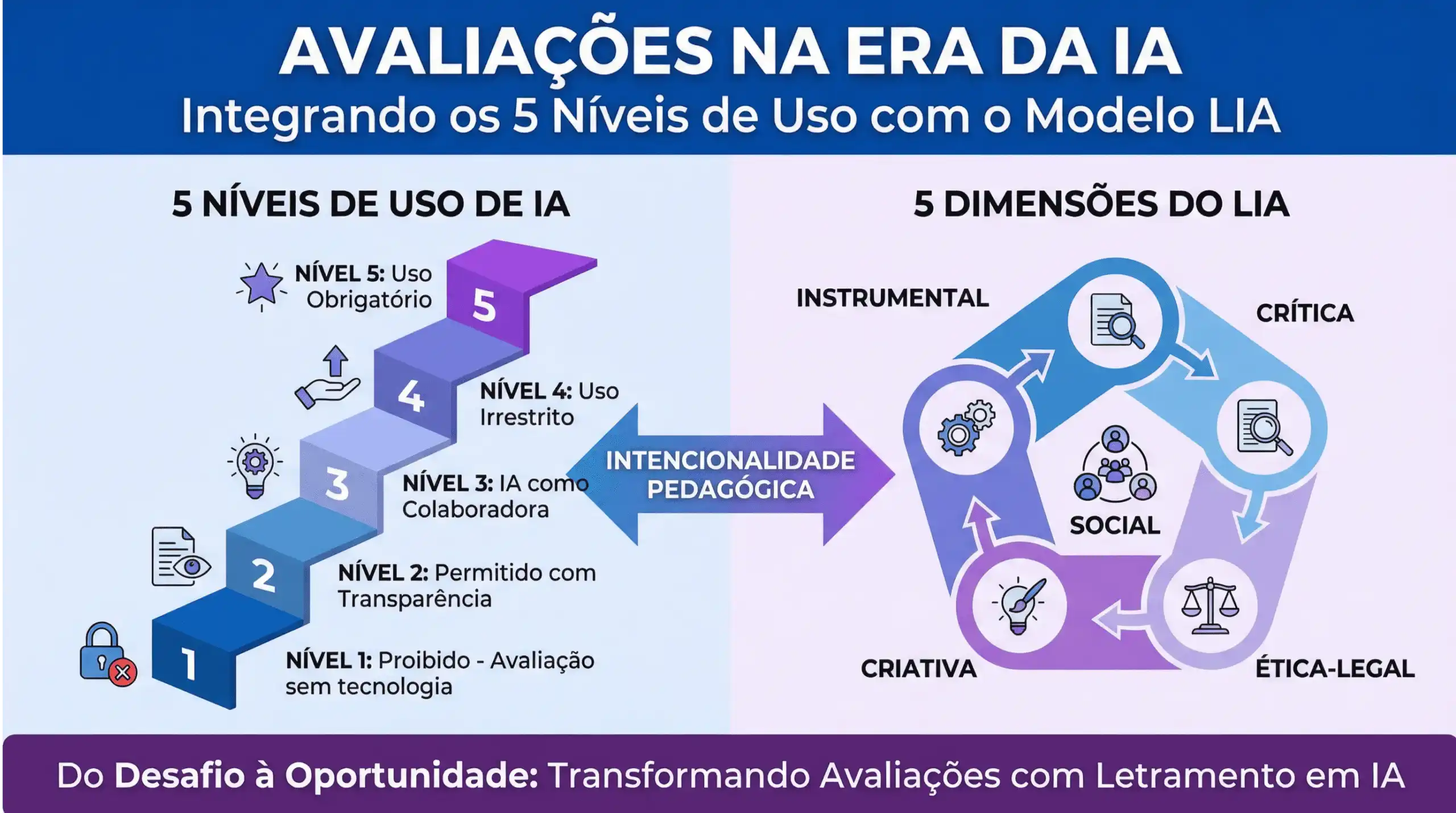 É aqui que o Letramento em Inteligência Artificial (LIA) amplia o debate. Como framework brasileiro, o LIA vai além do uso instrumental e propõe uma formação integrada em cinco dimensões — Instrumental, Crítica, Ética-Legal, Criativa e Social. Quando conectamos a escala de Cintra ao LIA, a avaliação deixa de ser apenas um “controle do uso” e passa a ser uma oportunidade concreta de desenvolver competências essenciais para o século XXI.